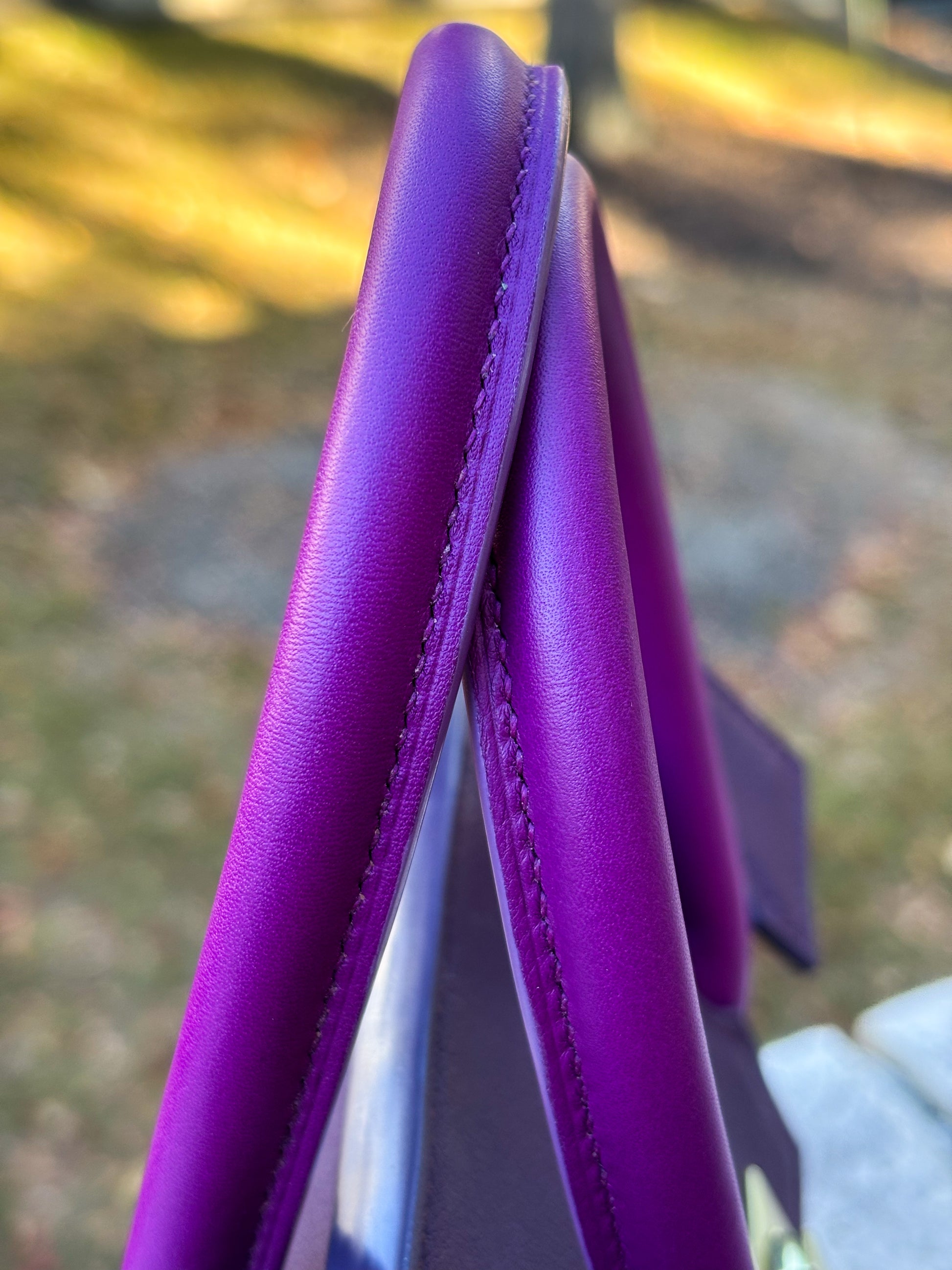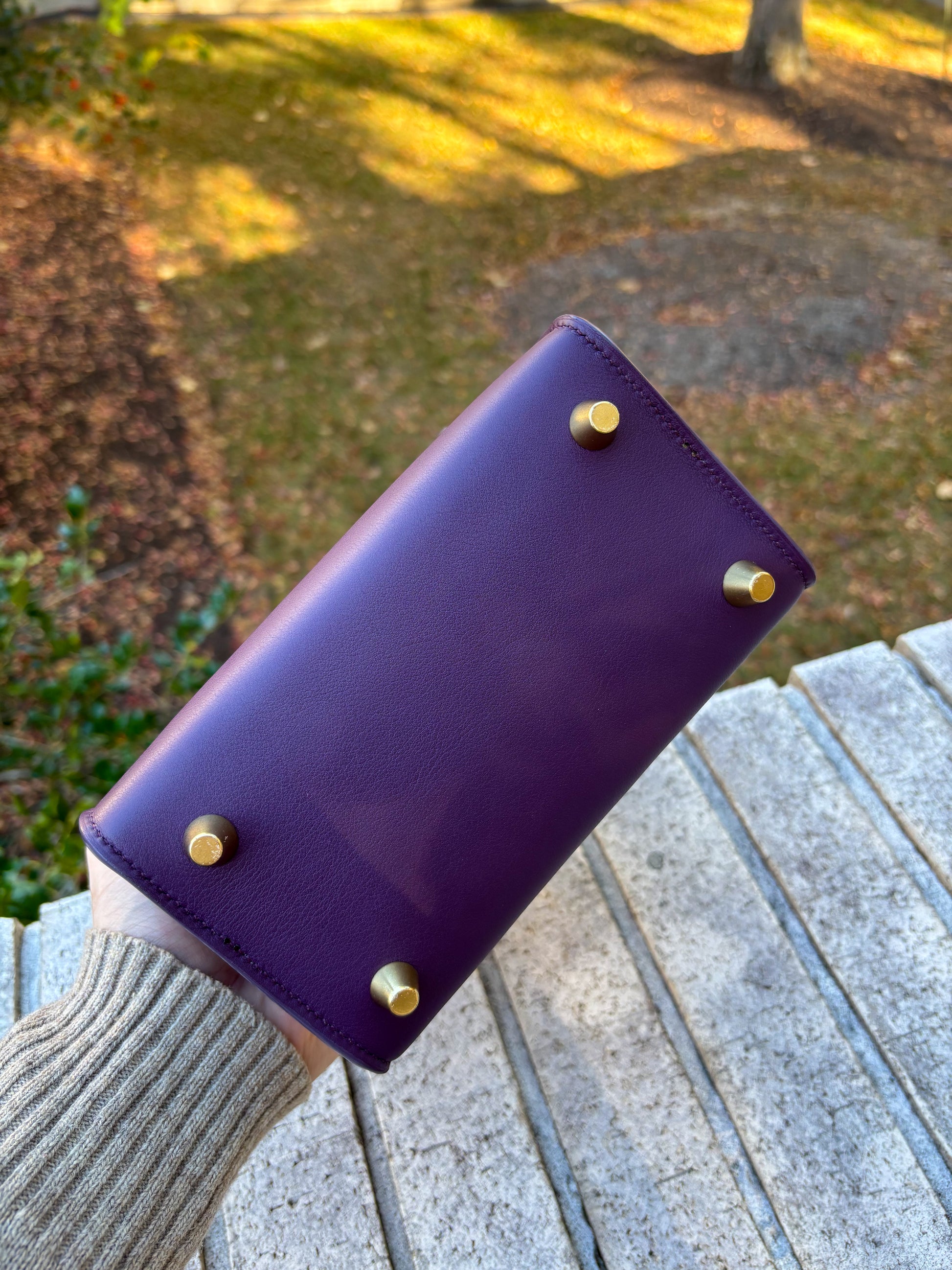 Truly a classic design with an elegant silhouette. This is made to be subtle and understated while exemplifying the best of my craftsmanship. The exterior is Aubergine and Anemone smooth calf (swift) leather and the inner lining is Chevre in taupe. The strap is black cotton with Anemone leather detailing and can be adjusted for shoulder or crossbody wear.