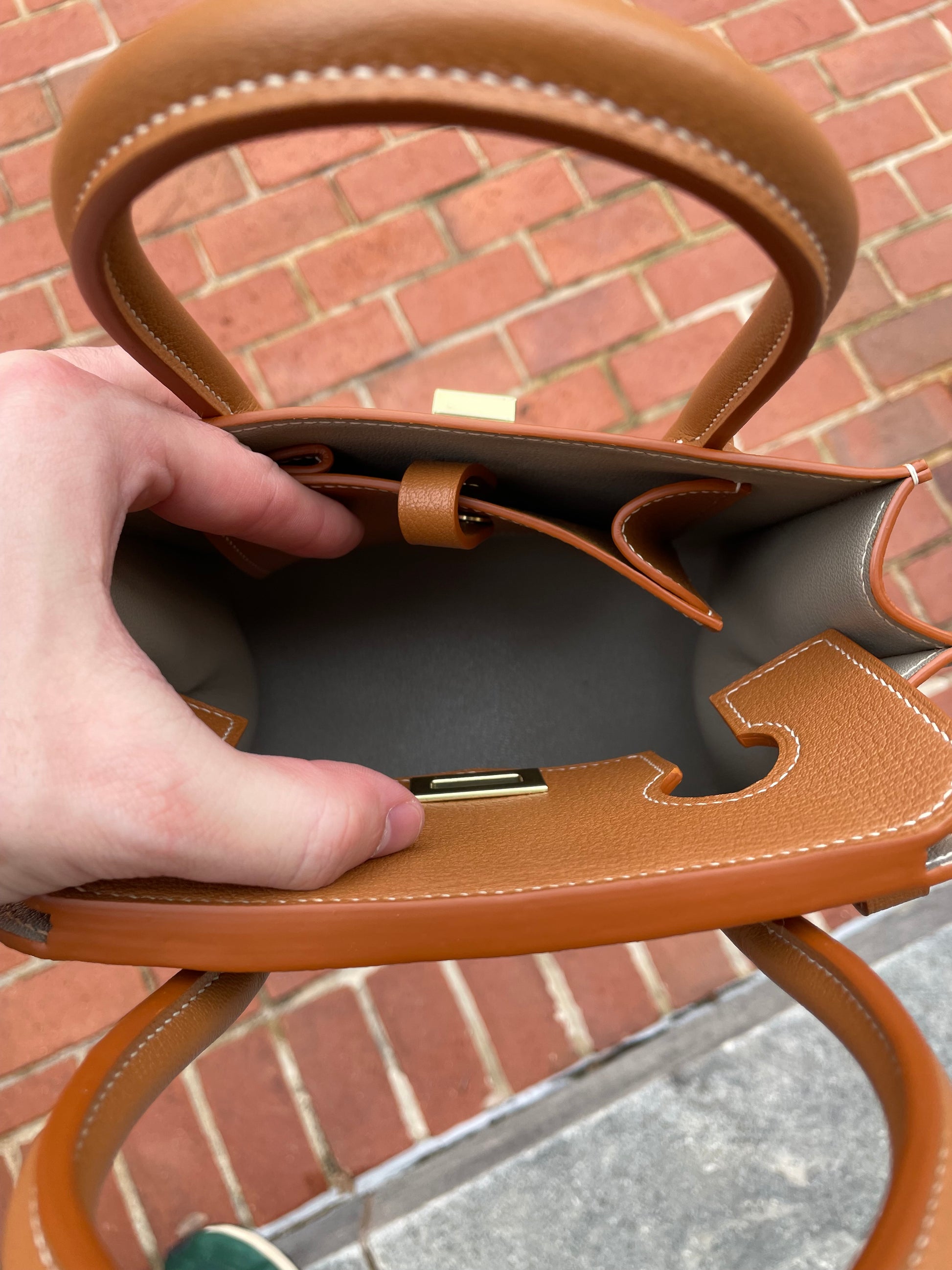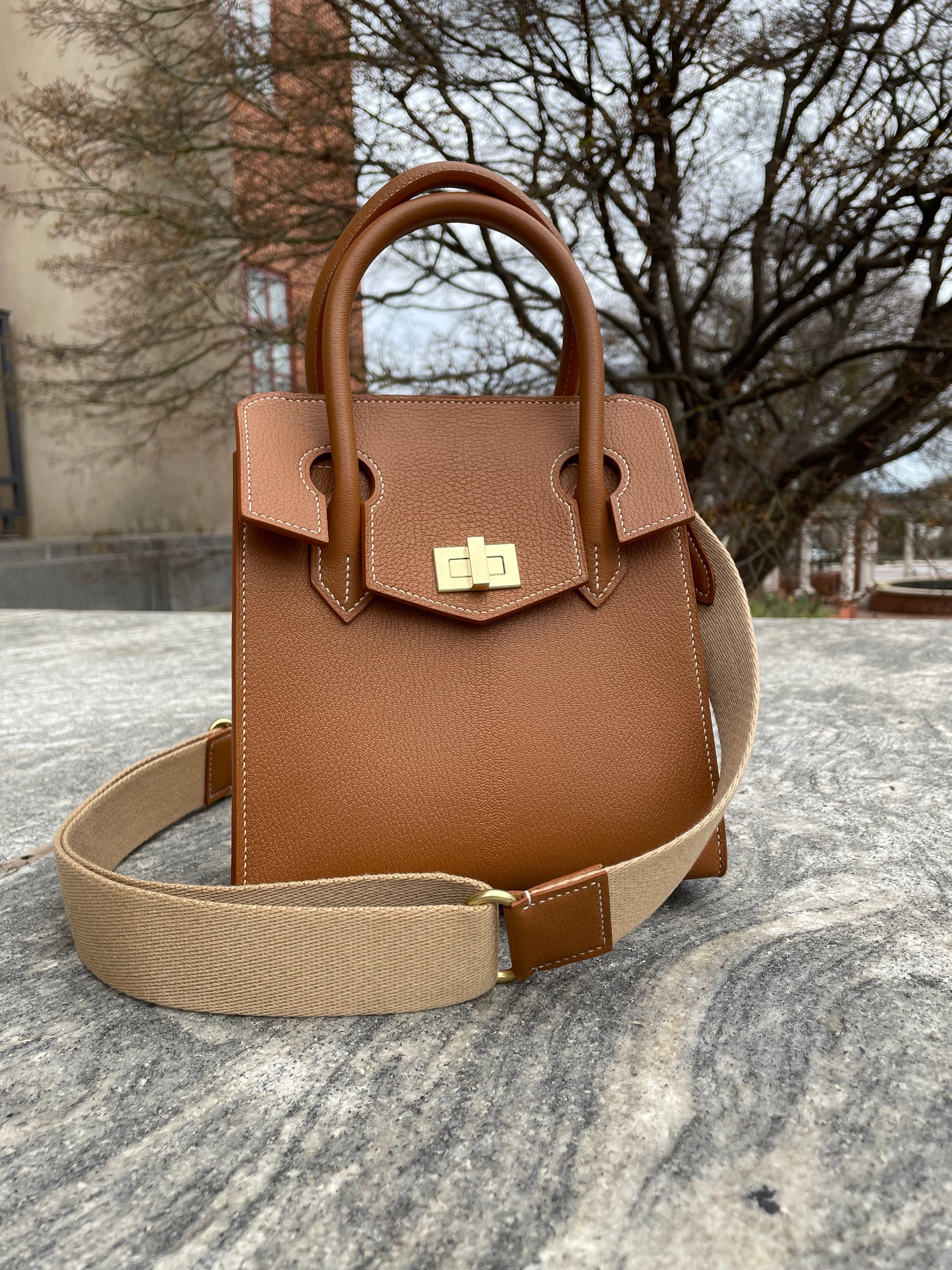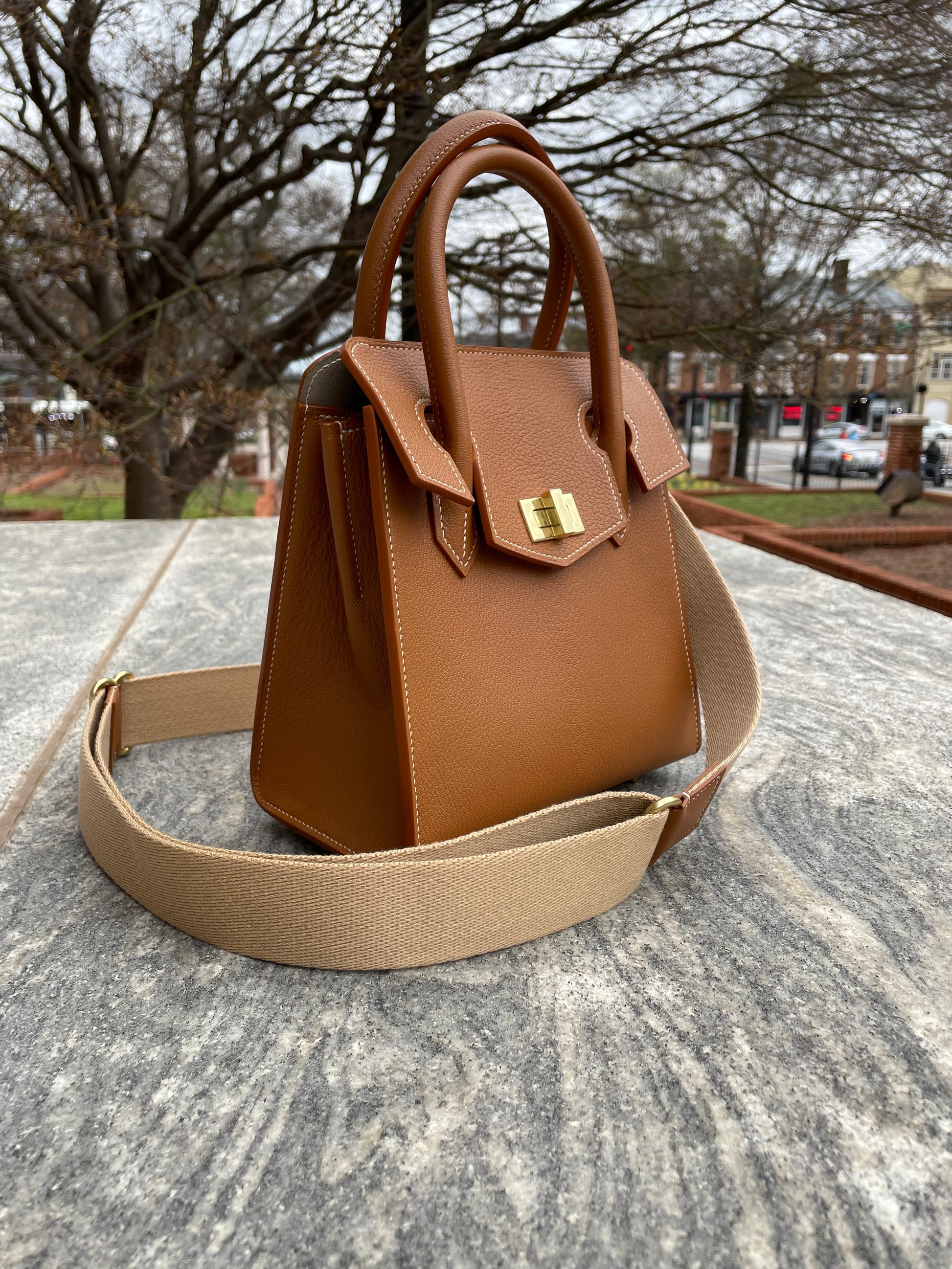 Truly a classic design with an elegant silhouette. This is made to be subtle and understated while exemplifying the best of my craftsmanship. The exterior is Golden Brown Chevre and the inner lining is Chevre in taupe. The strap is cotton and can be adjusted for shoulder or crossbody wear.