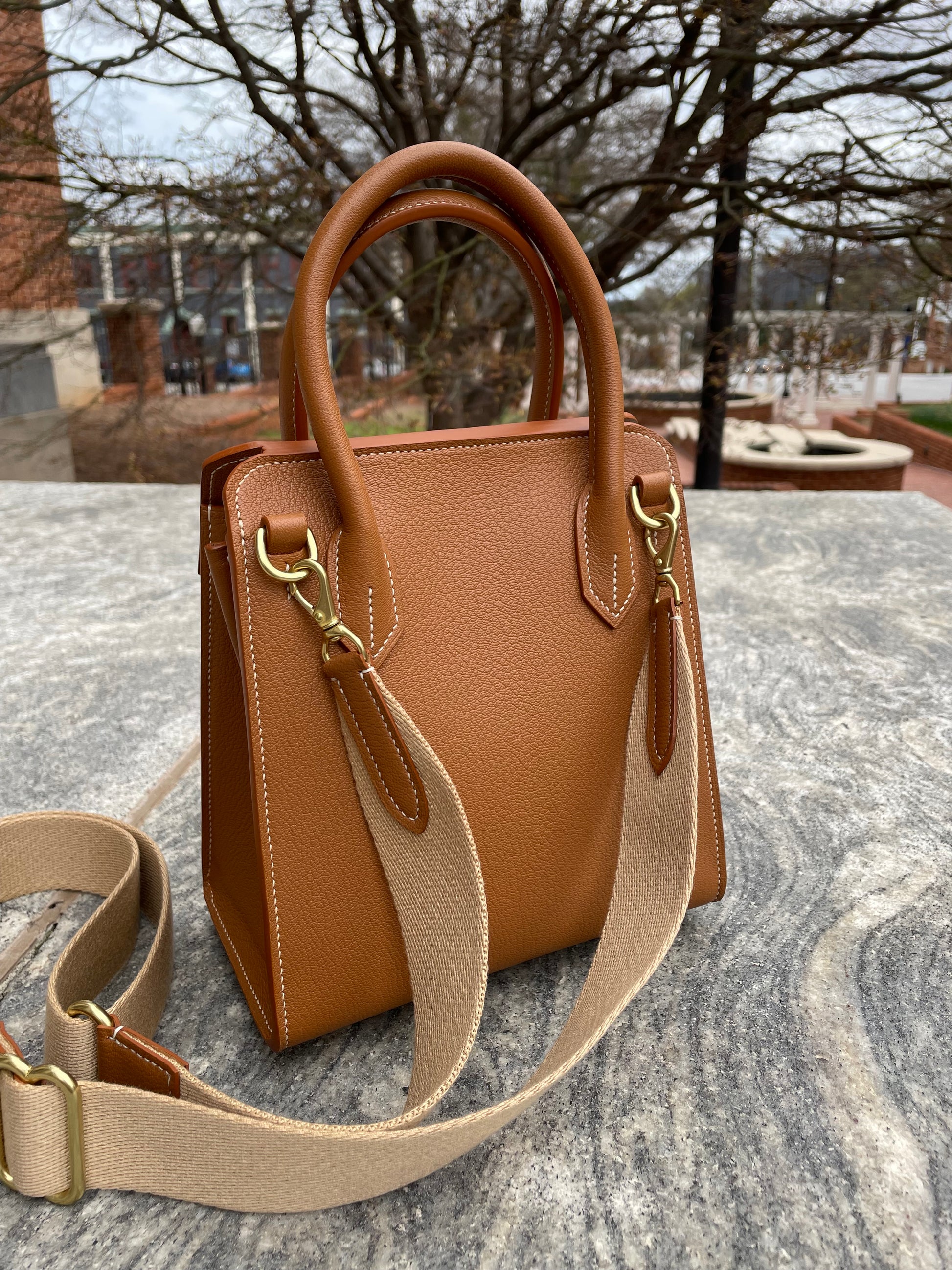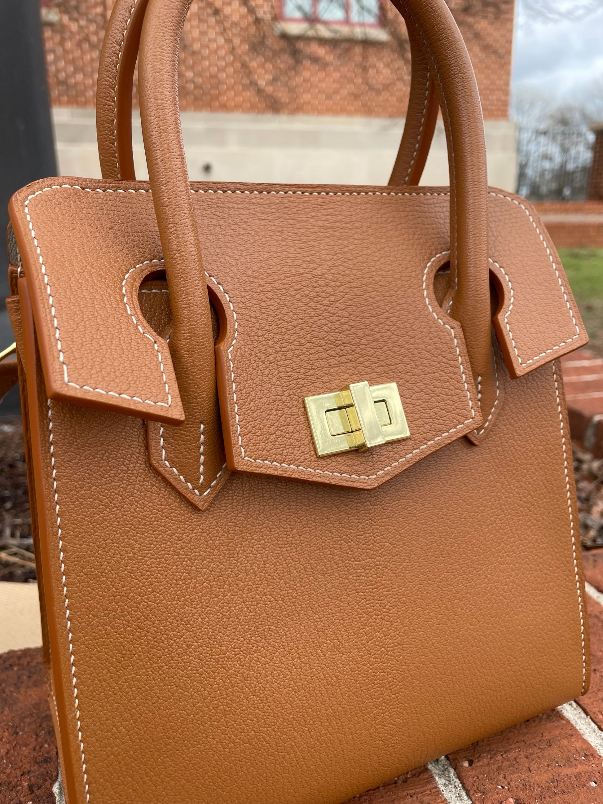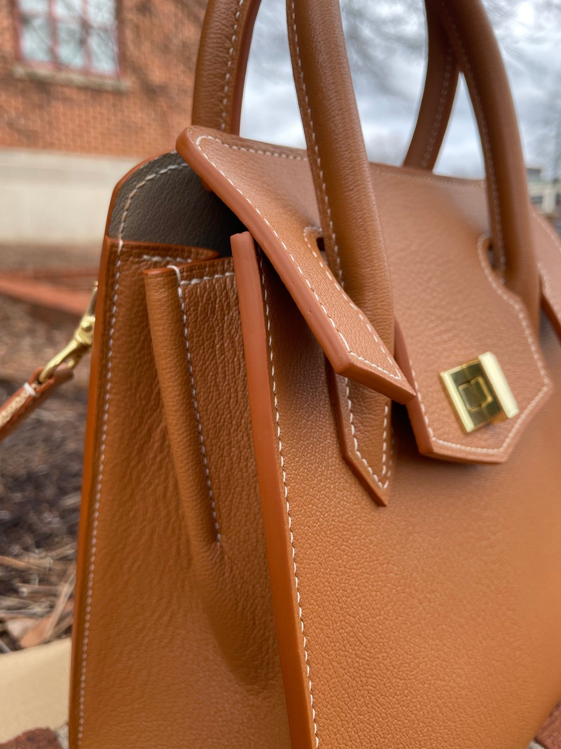 Truly a classic design with an elegant silhouette. This is made to be subtle and understated while exemplifying the best of my craftsmanship. The exterior is Golden Brown Chevre and the inner lining is Chevre in taupe. The strap is cotton and can be adjusted for shoulder or crossbody wear.