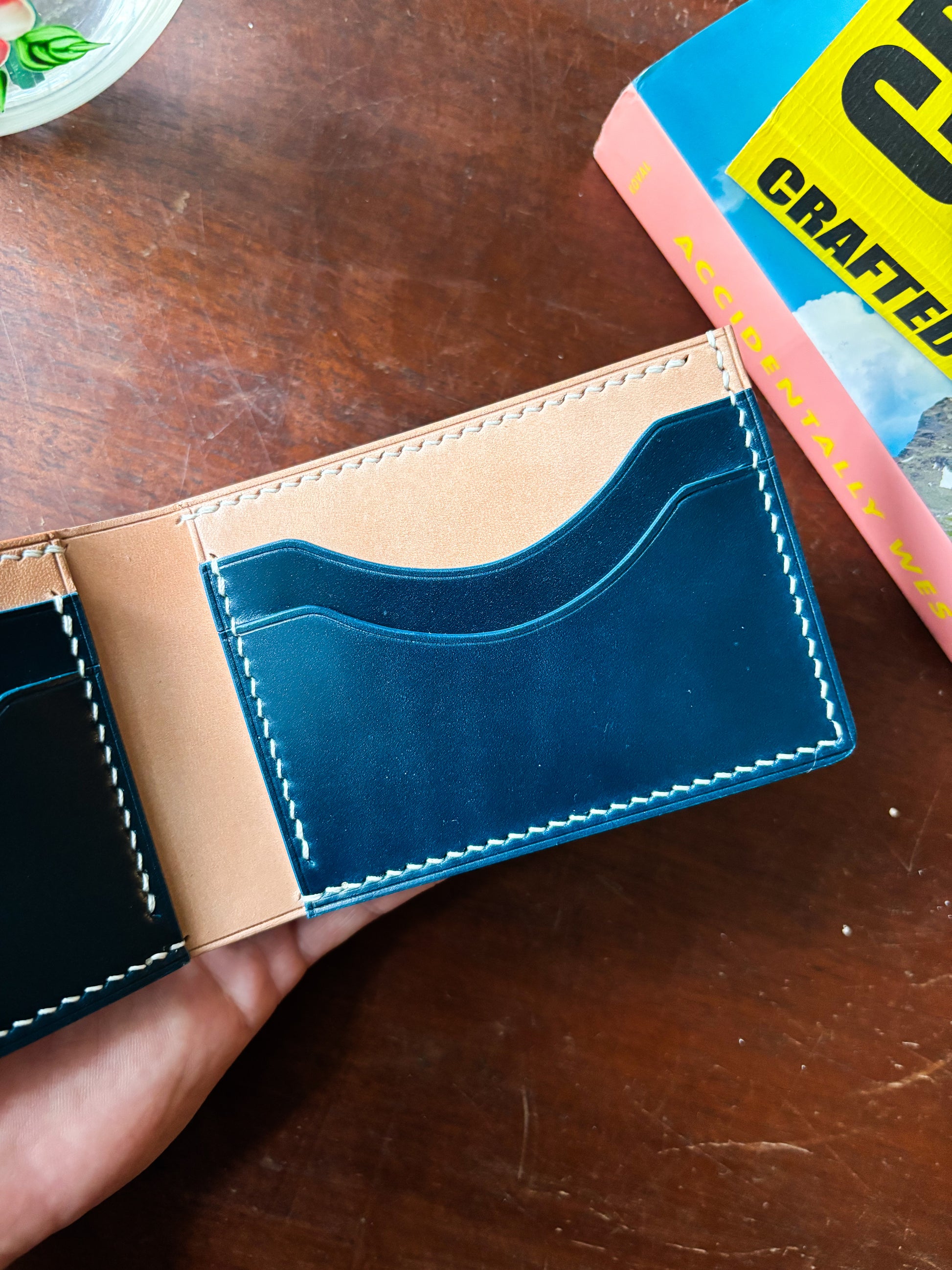 This wallet uses deep blue Shell Cordovan by Shinki Hikaku and Natural by Wickett and Craig. Shell Cordovan is quite a special leather and the price reflects that. It is known for its durability and rich, deep color. It is beautiful and will patina very well.